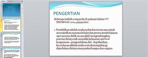 Power point tentang pendidikan dapat menjadi alat yang sangat efektif untuk menyampaikan informasi kepada siswa. Dalam pembuatan presentasi, pastikan untuk menggunakan desain yang menarik, mengatur teks dengan baik, menggunakan grafik dan diagram, menyajikan informasi dengan singkat dan padat, menggunakan animasi dengan bijak, menggunakan media dan video, menggunakan referensi dan sumber yang terpercaya, serta berlatih secara teratur. Dengan mengikuti tips dan panduan di atas, anda dapat membuat power point tentang pendidikan yang menarik dan efektif.